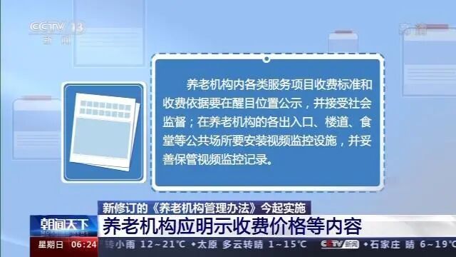 养老机构内各类服务项目收费标准和收费依据要在醒目位置公示,并接受社会监督;在养老机构的各出入口、楼道、食堂等公共场所要安装视频监控设施,并妥善保管视频监控记录。