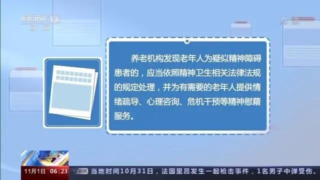 养老机构发现老年人为疑似精神障碍患者的,应当依照精神卫生相关法律法规的规定处理,并为有需要的老年人提供情绪疏导、心理咨询、危机干预等精神慰藉服务。