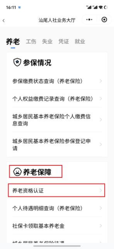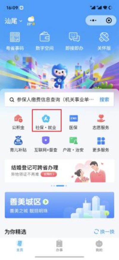 ①微信搜索“粤省事”小程序,选择城市为汕尾市,下滑选择【社保·就业】服务板块。