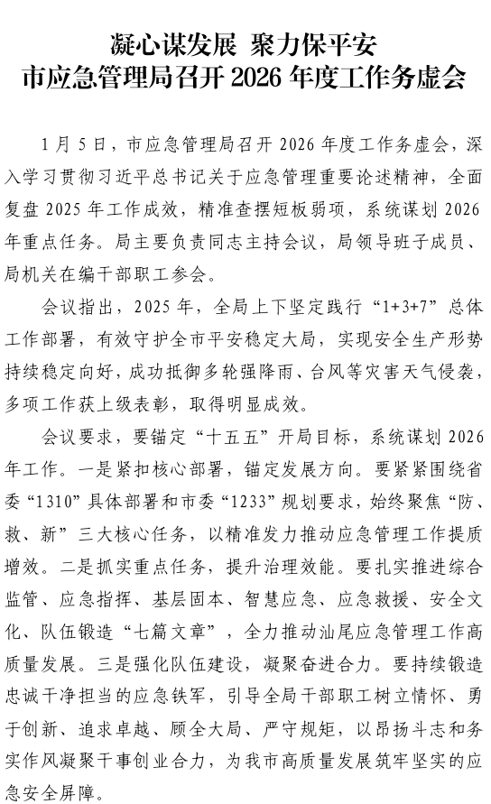 汕尾市应急管理工作简报(2026年第1期)