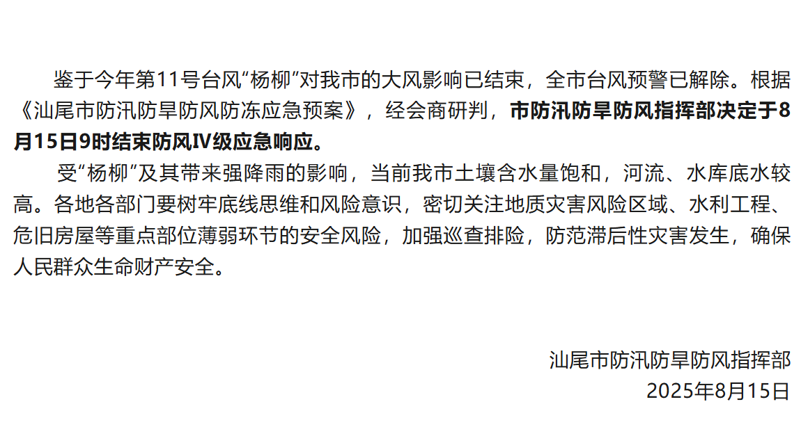 汕尾市防汛防旱防风指挥部关于结束防风Ⅳ级应急响应的通知