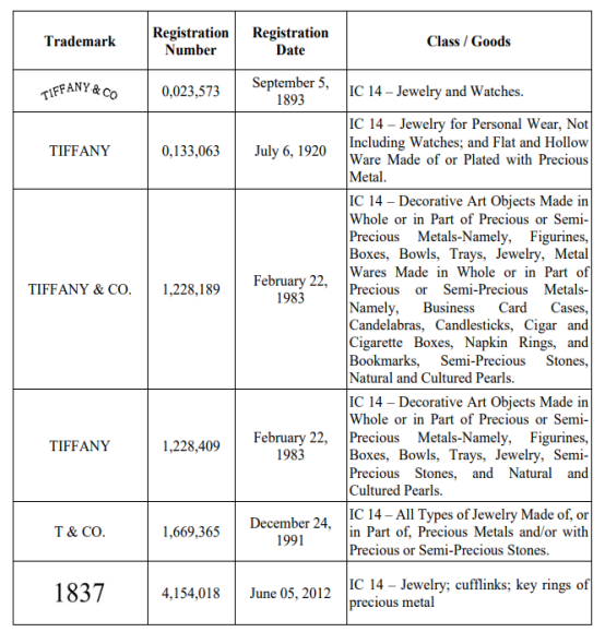 蒂芙尼近年在美国发起的侵权诉讼案由均为商标,其中还包括部分商业外观,部分如下: