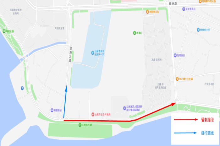 (一)需途经管制路段的车辆请提前绕行至红海大道、香洲路、东城大道,同时注意安全、减速慢行、服从执勤民辅警的指挥。