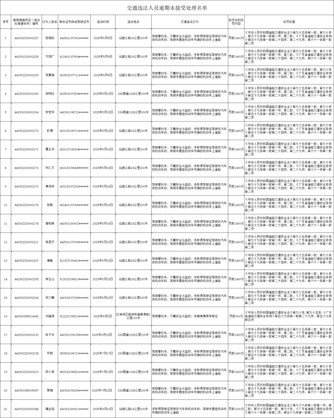 以下21名驾驶人(名单附后)因道路交通安全违法行为被汕尾市公安局交通管理支队红海湾大队查获,驾驶人因无正当理由逾期未接受处理,现依据《中华人民共和国行政处罚法》第四十四条、《中华人民共和国道路交通安全法》第一百一十条、《公安机关办理行政案件程序规定》第一百六十七条和第一百六十八条之规定,拟依法对当事人作出行政处罚决定,现予以公告告知。如有异议,可在公告之日起七日内向汕尾市公安局交通管理支队红海湾大队提出陈述、申辩或听证申请,逾期未提出的,视为放弃相关权利,汕尾市公安局交通管理支队红海湾大队将依法作出行政处罚决定。