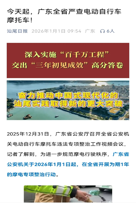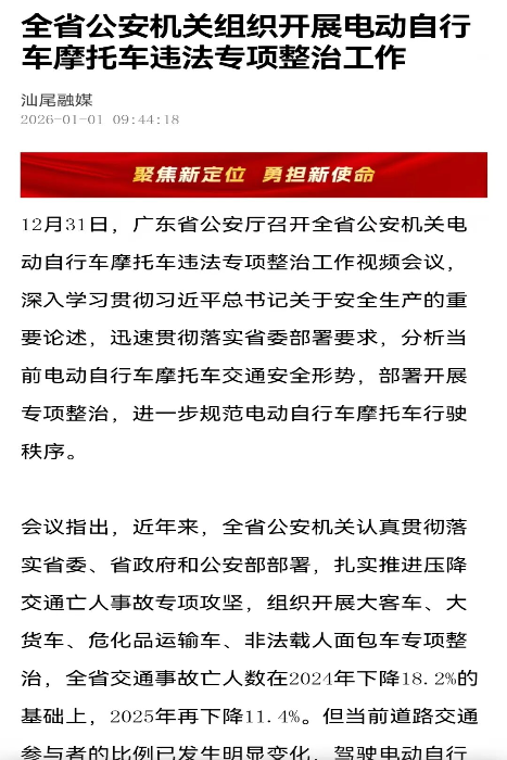 为进一步规范摩电行驶秩序,根据上级公安机关的工作部署,汕尾市公安机关从2026年1月1日起,在全市开展为期1年的摩电专项整治行动,力争到年底前实现摩电交通秩序明显改善,摩电守法率明显提升、摩电违法查处量明显提升、骑乘人员交通安全意识明显提升的“一改善三提升”目标。