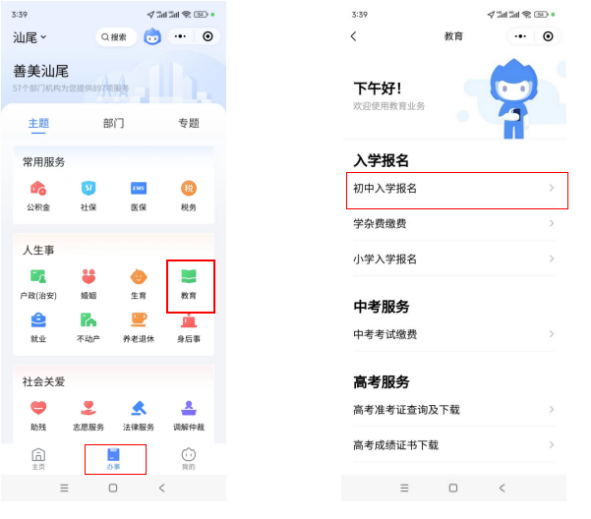 登录“粤省事”小程序→办事→教育→初中入学报名→民办学校小升初入学报名→……