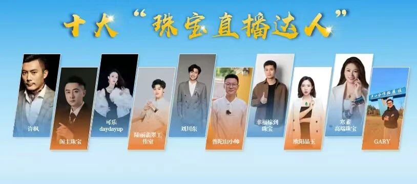十大“珠宝直播达人”:刘川东、普陀山小帅、陆丽翡翠工作室、幸福嫁到珠宝、可乐daydayup、欧阳品玉、阁主珠宝、寒素高端珠宝、许枫、Gary 。