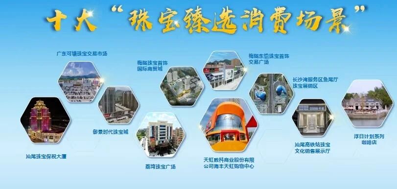 十大“珠宝臻选消费场景”:天虹数科商业股份有限公司海丰天虹购物中心、广东可塘珠宝交易市场、御景时代珠宝城、荔塆珠宝广场、梅陇珠宝首饰国际商贸城、梅陇东怡珠宝首饰交易广场、汕尾珠宝保税大厦、长沙湾服务区鱼尾厅珠宝展销区、汕尾高铁站珠宝文化销售展示厅、浮日计划系列咖啡店。