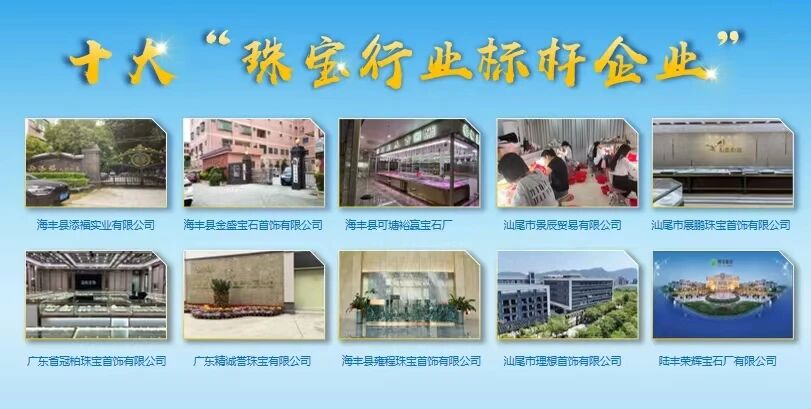 十大“珠宝行业标杆企业”:海丰县添福实业有限公司、海丰县金盛宝石首饰有限公司、海丰县可塘裕赢宝石厂、汕尾市景辰贸易有限公司、汕尾市展鹏珠宝首饰有限公司、广东省冠柏珠宝首饰有限公司、广东精诚誉珠宝有限公司、海丰县雍程珠宝首饰有限公司、汕尾市理想首饰有限公司、陆丰荣辉宝石厂有限公司。