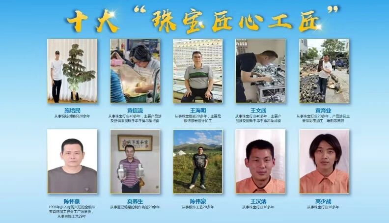 十大“珠宝匠心工匠”:施培民、黄信流、王海明、王文质、黄育业、陈怀泉、夏养生、陈伟豪、王汉炳、高少战。