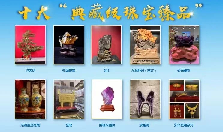十大“典藏级珠宝臻品”:迎客松、钛晶茶壶、超七、九龙神州(南红)、极光貔貅、足银镀金花瓶、金鼎、舒俱来摆件、紫晶洞、朱华金缕系列。
