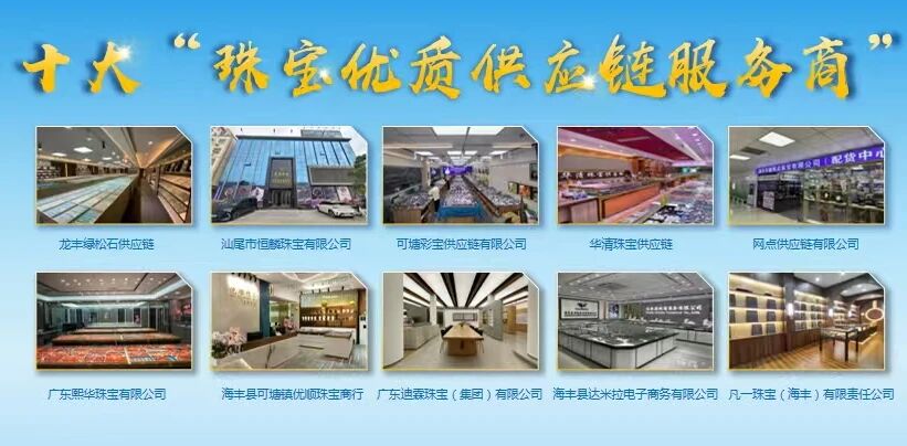 十大“珠宝优质供应链服务商”:龙丰绿松石供应链、汕尾市恒麟珠宝有限公司、可塘彩宝供应链有限公司、华清珠宝供应链、网点供应链有限公司、广东熙华珠宝有限公司、海丰县可塘镇优顺珠宝商行、广东迪霖珠宝(集团)有限公司、海丰县达米拉电子商务有限公司、凡一珠宝(海丰)有限责任公司。