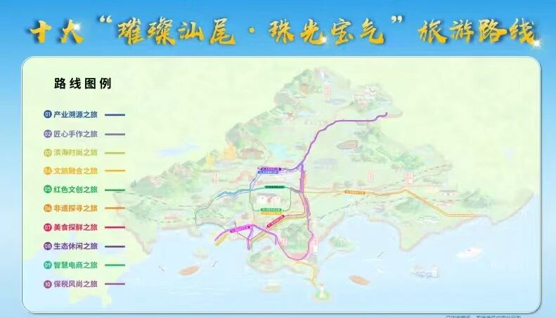 十大“璀璨汕尾•珠光宝气”旅游路线:产业溯源之旅、匠心手作之旅、滨海时尚之旅、文旅融合之旅、红色文创之旅、非遗探寻之旅、美食探鲜之旅、生态休闲之旅、智慧电商之旅、保税风尚之旅。
