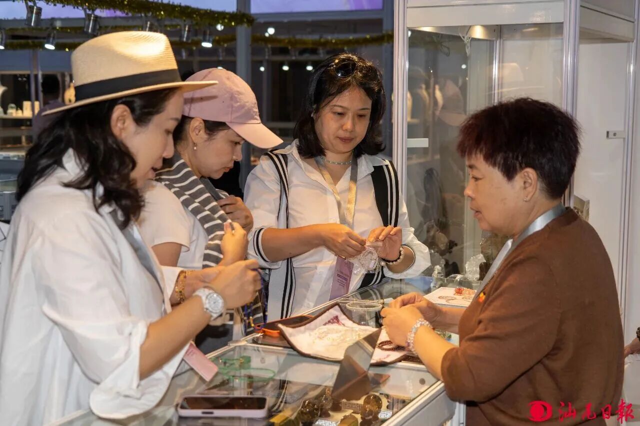 记者在现场看到,各展区人流如织,互动热烈。在珠盈珠宝有限公司展位前,来自深圳的林女士正悉心挑选陈列有序的淡水珍珠,不时与展商交流甄别心得。她赞叹道:“展会的水准真是超出预期!珍珠品质上乘,设计也别具匠心,让我们看到了汕尾珠宝产业的实力和魅力。”
