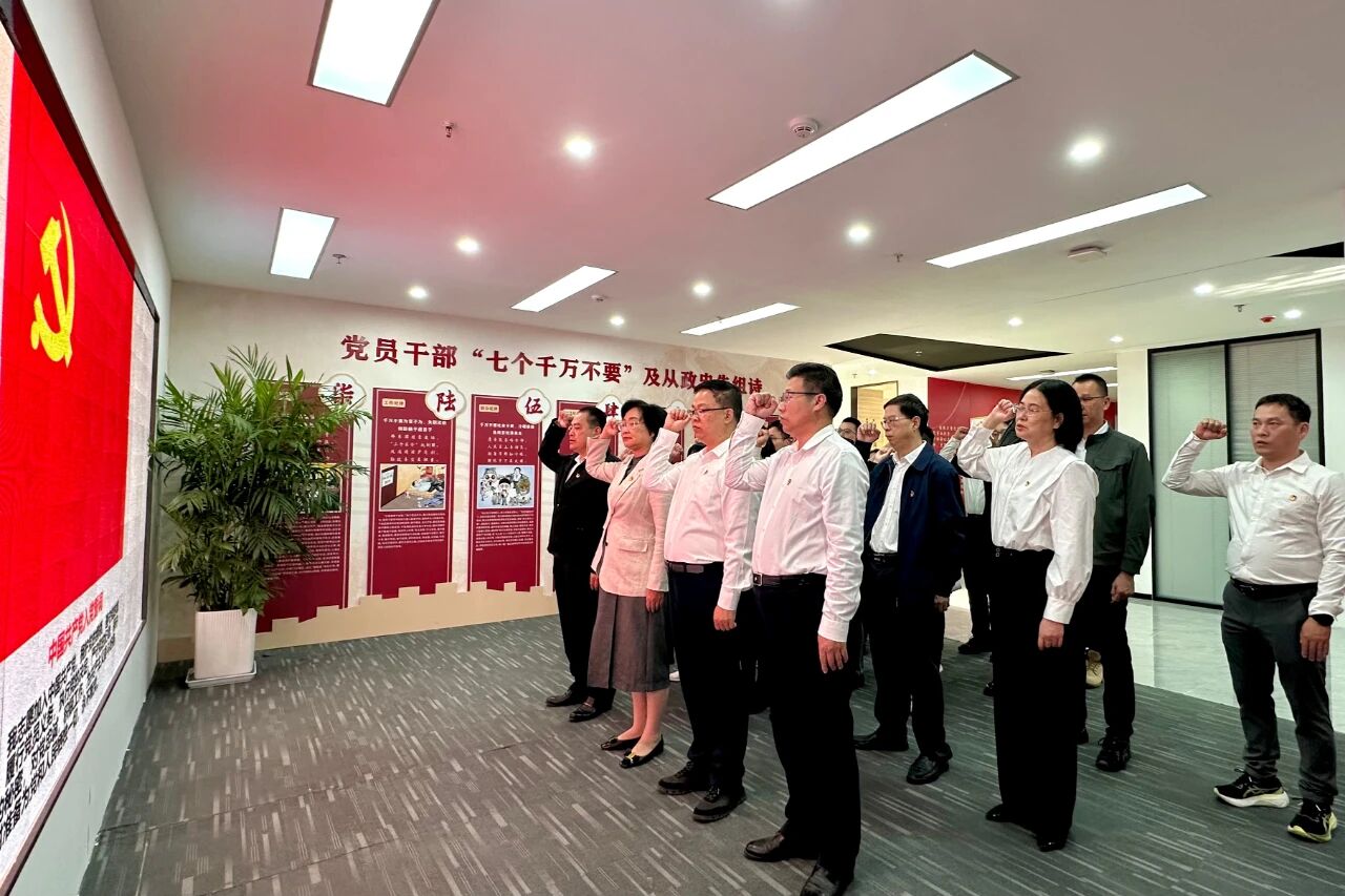 在廉政教育基地,党员干部依次参观了“百年风华”“海陆廉韵”“警钟长鸣”“固本清源”等主题展厅,认真聆听讲解,重温习近平总书记有关全面从严治党的谆谆教诲,深入了解我市党风廉政建设和反腐败斗争取得的成果。一个个发生在身边的真实案例、一段段发自肺腑的忏悔影像,生动揭示了从“一念之差”到“一墙之隔”的深刻教训,警示党员干部必须时刻绷紧廉洁自律这根弦,做到警钟长鸣、防微杜渐。活动中,全体党员干部面向党旗庄严宣誓,重温入党誓词,并现场签署了《廉政勤政承诺书》。