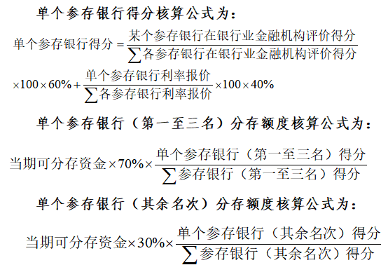 单个银行机构(第一至三名)分存额=当期可分存的财政性存款额×70%×(单个银行机构在银行业金融机构评价得分/第一至三名银行机构在银行业金融机构评价得分之和)。单个银行机构(其余名次)分存额=当期可分存的财政性存款额×30%×(单个银行机构在银行业金融机构评价得分/其余名次银行机构在银行业金融机构评价得分之和)。