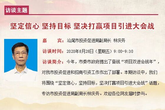 林庆务:主持人好!各位网民朋友们大家好!我是汕尾市投资促进局林庆务。非常感谢“在线访谈”栏目组的安排,让我今天有机会与各位网民朋友进行线上“面对面”的接触交流。如果各位网友想了解我市招商引资方面的情况,或者对我们招商引资工作有什么好的意见、建议,我们诚挚欢迎,并详细解答,对您提出的意见建议,我们一定认真研究。我真诚地希望通过这次“在线访谈”活动,能够广泛收集大家的宝贵意见,接受广大网民朋友的批评和监督,并以此来促进和提高我们的各项工作,共同推进我市招商引资的向好向快发展。