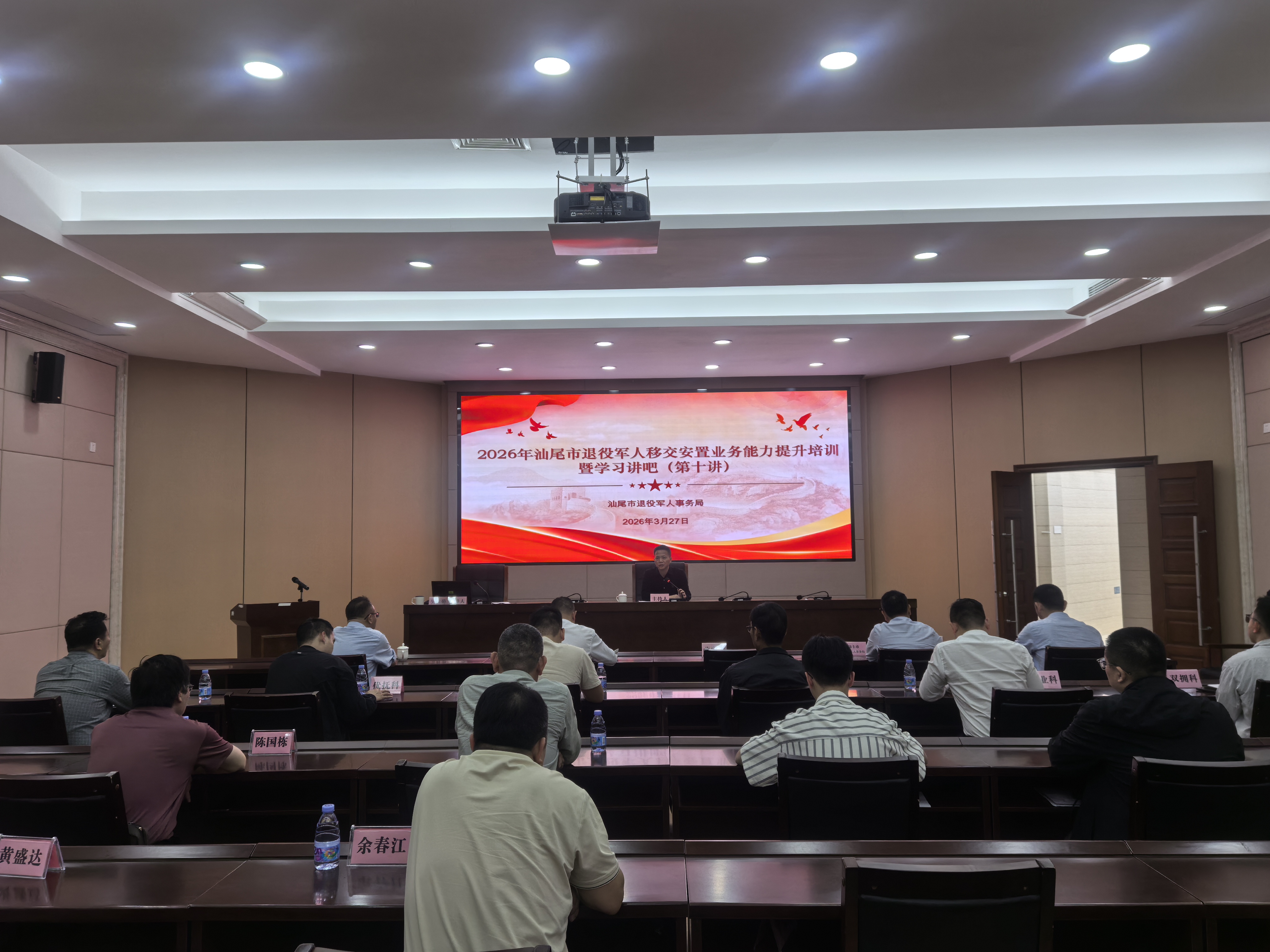 为深入学习贯彻习近平强军思想和习近平总书记关于退役军人工作的重要论述,持续提升全市退役军人移交安置工作质效和干部职工履职能力,3月27日下午,市退役军人事务局组织2026年汕尾市退役军人移交安置业务能力提升培训暨学习讲吧(第十讲)。市局机关各科室、局属各单位相关负责同志、青年理论学习小组成员,以及各县(市、区)退役军人事务局分管移交安置工作领导、业务骨干等40余名干部职工参训。