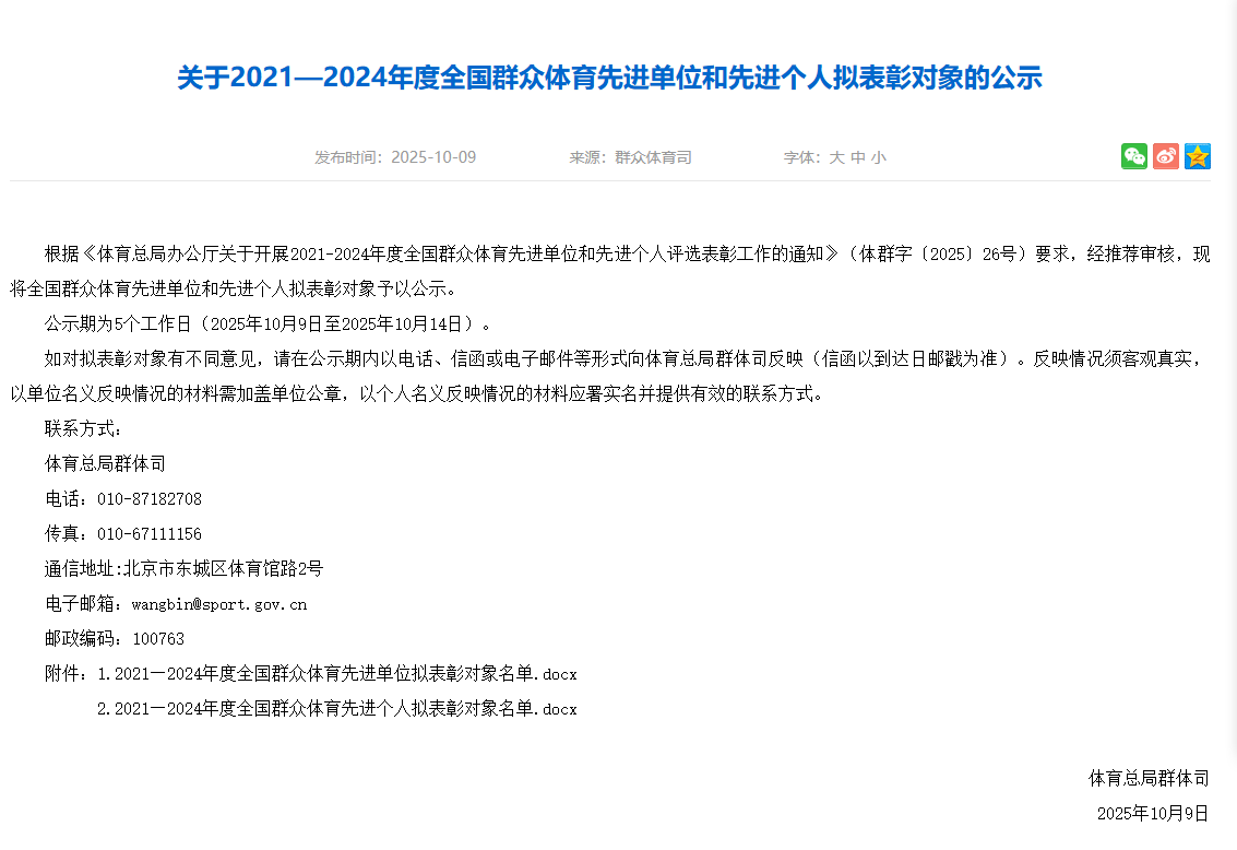 其中,我市5家单位获得 “2021-2024 年度全国群众体育先进单位”荣誉称号。具体名单如下: