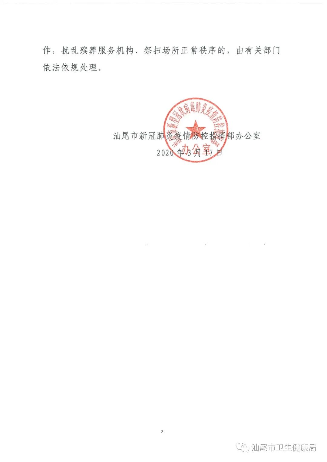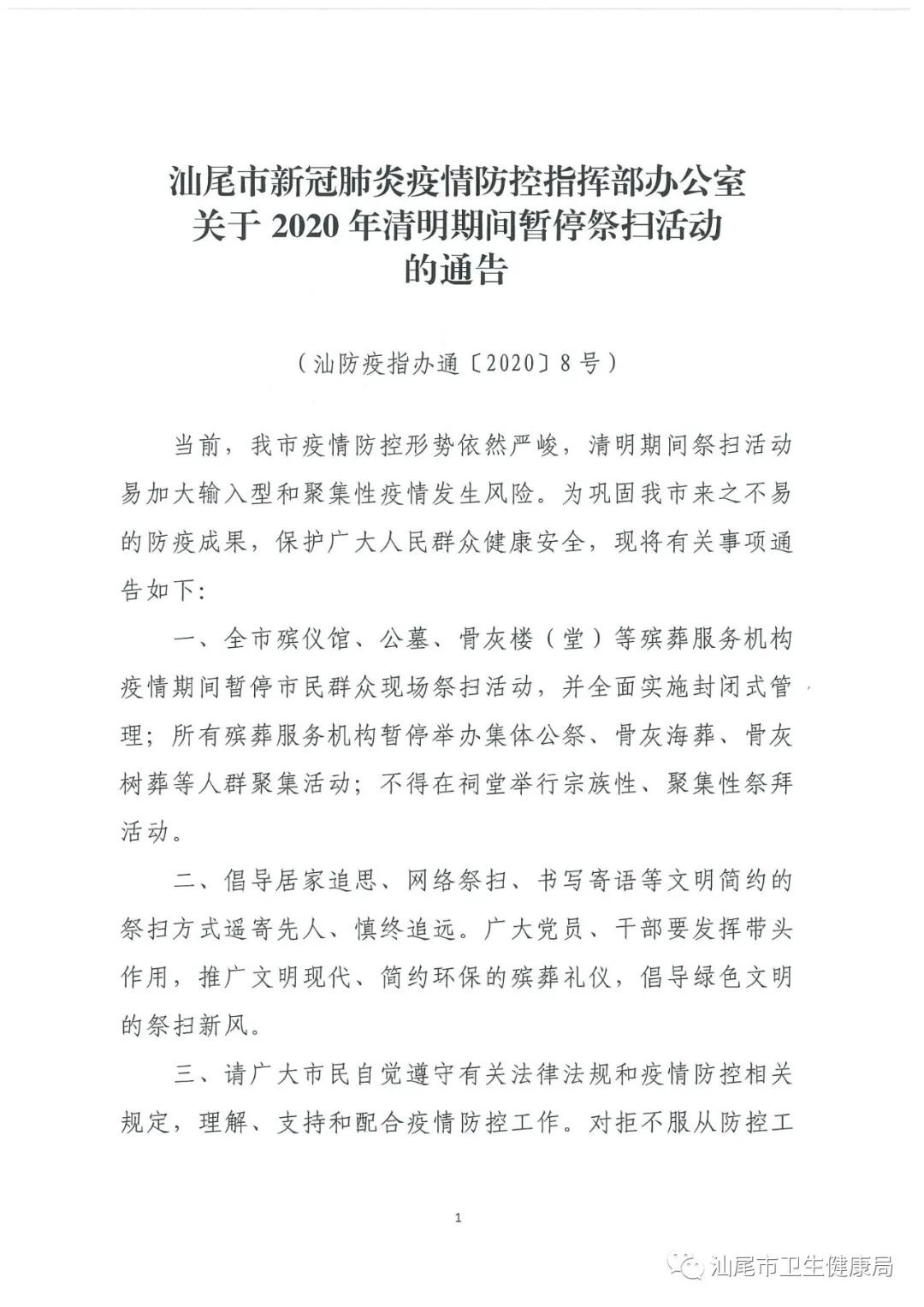 汕尾市新冠肺炎疫情防控指挥部办公室关于2020年清明期间暂停祭扫活动的通告